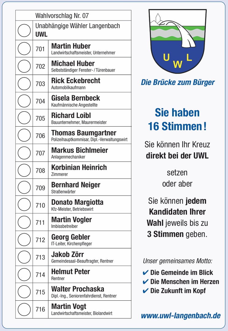 Sie können Ihr Kreuz bei UWL setzen oder jedem Kandidaten Ihrer Wahl jeweils bis zu 3 Stimmen geben